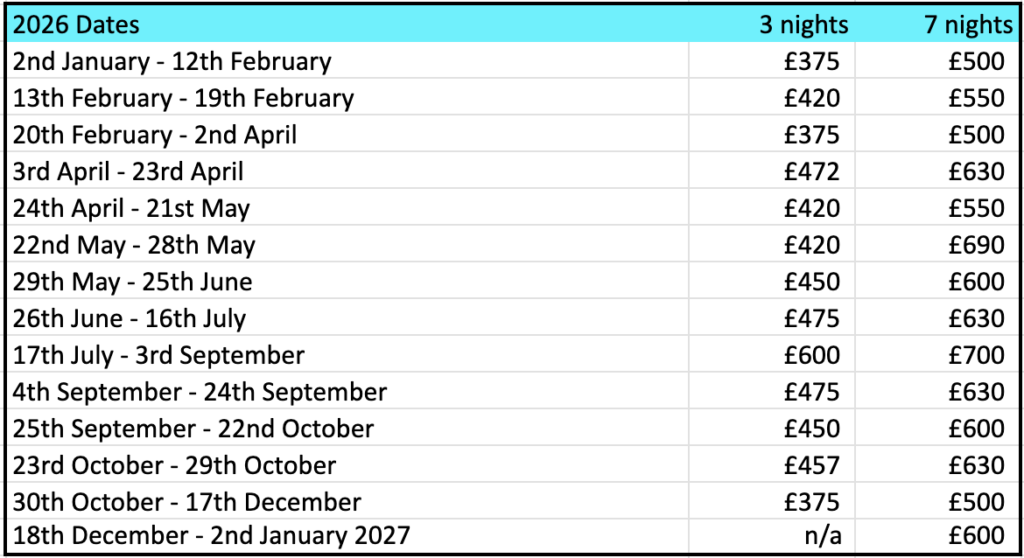 The apartment is available to rent throughout the year with stays of 3 or 7 nights.